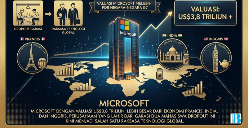 BANGGAI TIMES – Siapa sangka sebuah bisnis yang dirintis oleh dua pemuda yang memilih putus kuliah (dropout) demi mengejar mimpi di sebuah garasi kecil, kini menjelma menjadi kekuatan ekonomi yang melampaui negara-negara besar. Microsoft, perusahaan yang didirikan oleh Bill Gates dan Paul Allen, baru saja mencatatkan rekor valuasi yang mencengangkan dunia.