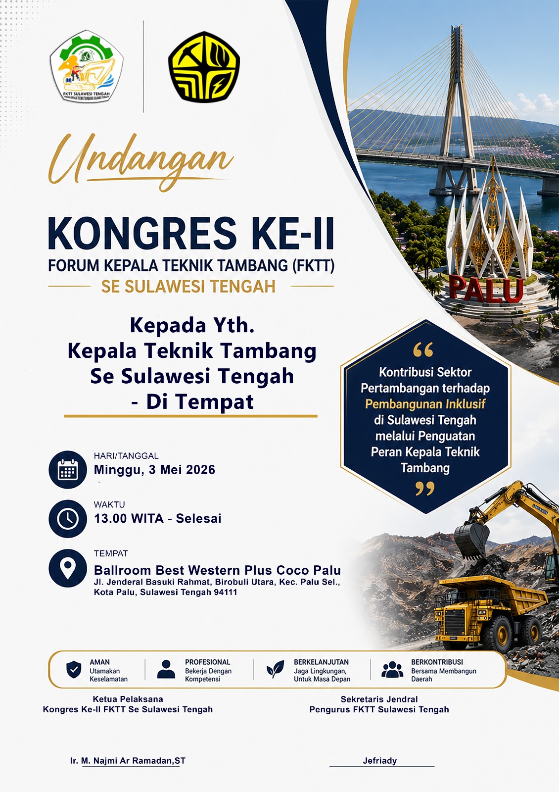 Dengan mengusung tema “Kontribusi Sektor Pertambangan Terhadap Pembangunan Inklusif di Sulawesi Tengah melalui Penguatan Peran Kepala Teknik Tambang”, kongres ini bertujuan menjadi katalisator bagi kemajuan industri ekstraktif yang lebih bertanggung jawab di wilayah tersebut.