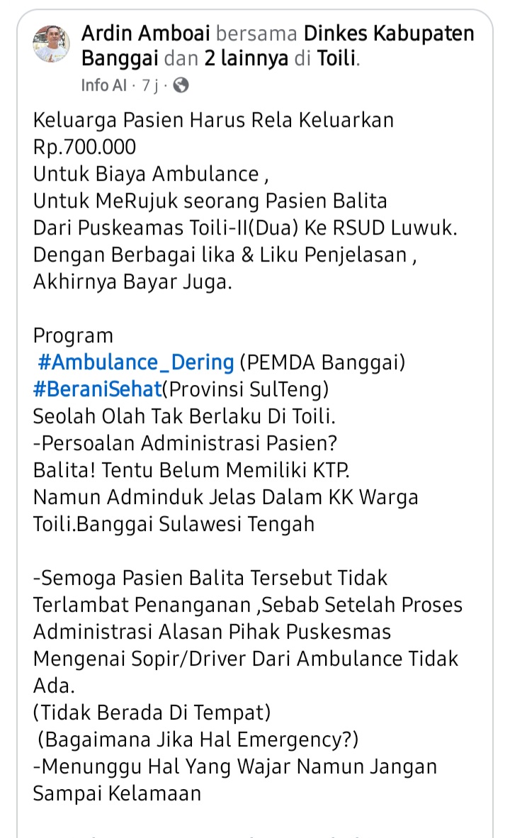 BANGGAI TIMES – Sebuah unggahan di media sosial Facebook oleh akun Ardin Amboai memantik perhatian publik setelah keluarga pasien mengaku dibebankan biaya ambulans sebesar Rp700.000 oleh Puskesmas Toili II, Kecamatan Toili, Kabupaten Banggai, Rabu (19/11/2025).