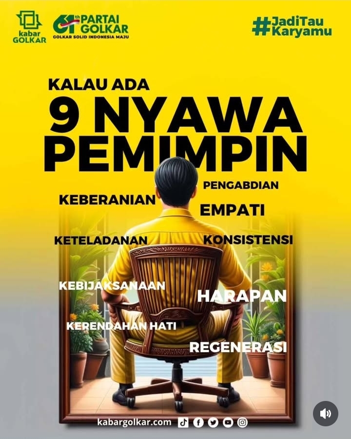 BANGGAI TIMES – Dalam momentum peringatan Hari Ulang Tahun ke-61, Partai Golkar kembali menegaskan nilai-nilai dasar kepemimpinan yang menjadi roh perjuangan partai melalui kampanye bertajuk “Kalau Ada 9 Nyawa Pemimpin”.
