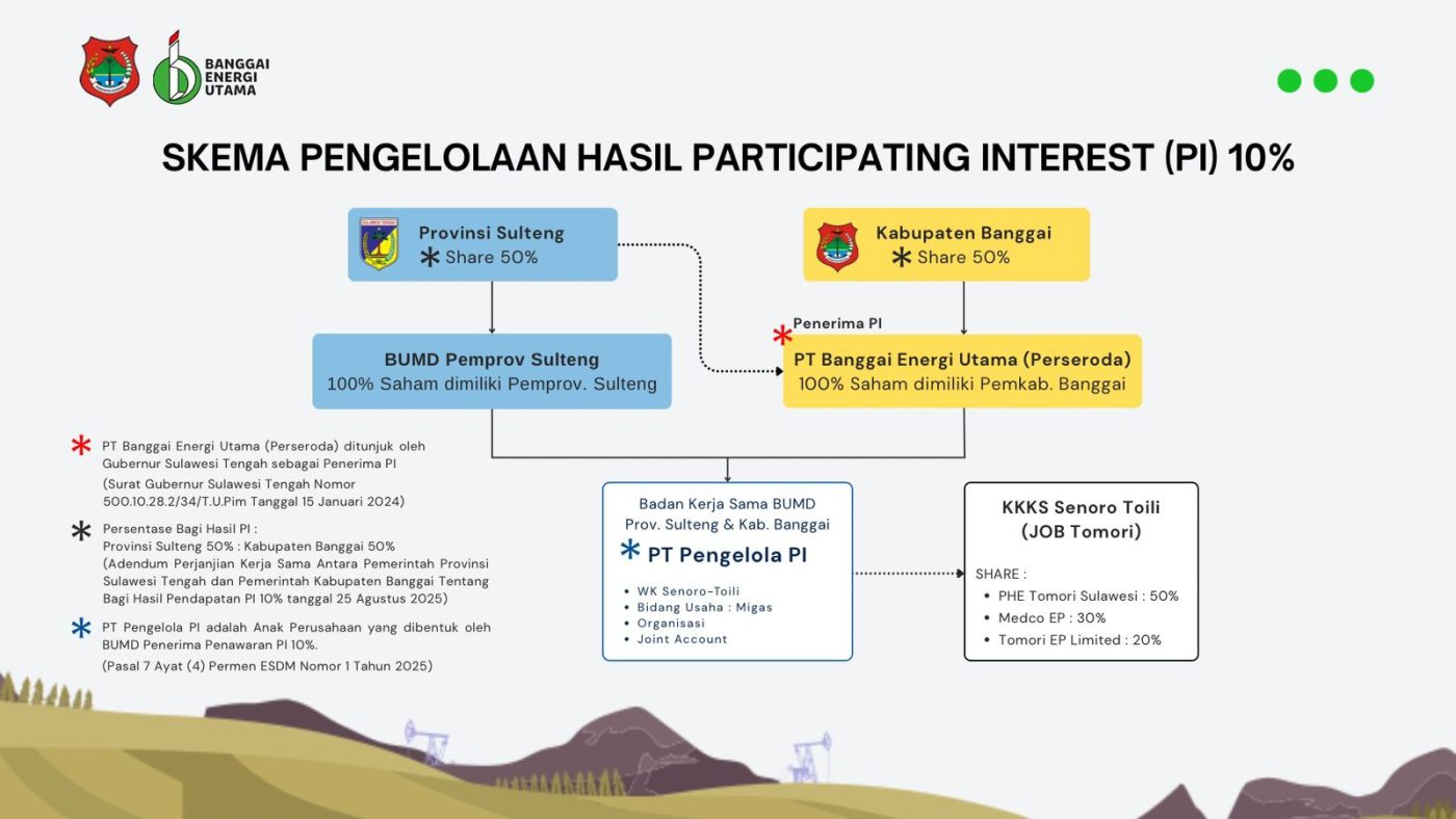 Dengan skema ini, Pemerintah Provinsi Sulawesi Tengah dan Pemerintah Kabupaten Banggai berharap pengelolaan PI 10 persen dapat memberikan kontribusi signifikan terhadap pendapatan daerah, mendorong penguatan BUMD, serta meningkatkan kesejahteraan masyarakat di wilayah sekitar operasi migas. *