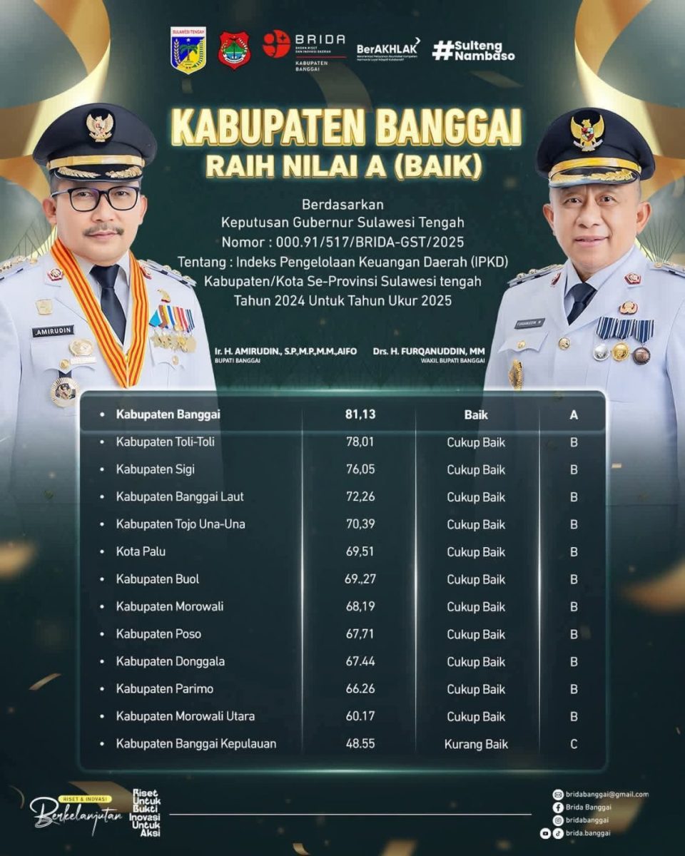 BANGGAI TIMES – Pemerintah Kabupaten Banggai berhasil meraih nilai A (Baik) dalam penilaian Indeks Pengelolaan Keuangan Daerah (IPKD) untuk tahun ukur 2025. Capaian ini berdasarkan Keputusan Gubernur Sulawesi Tengah Nomor: 000.91/517/BRIDA-GST/2025, tentang hasil evaluasi pengelolaan keuangan daerah kabupaten/kota se-Provinsi Sulawesi Tengah.